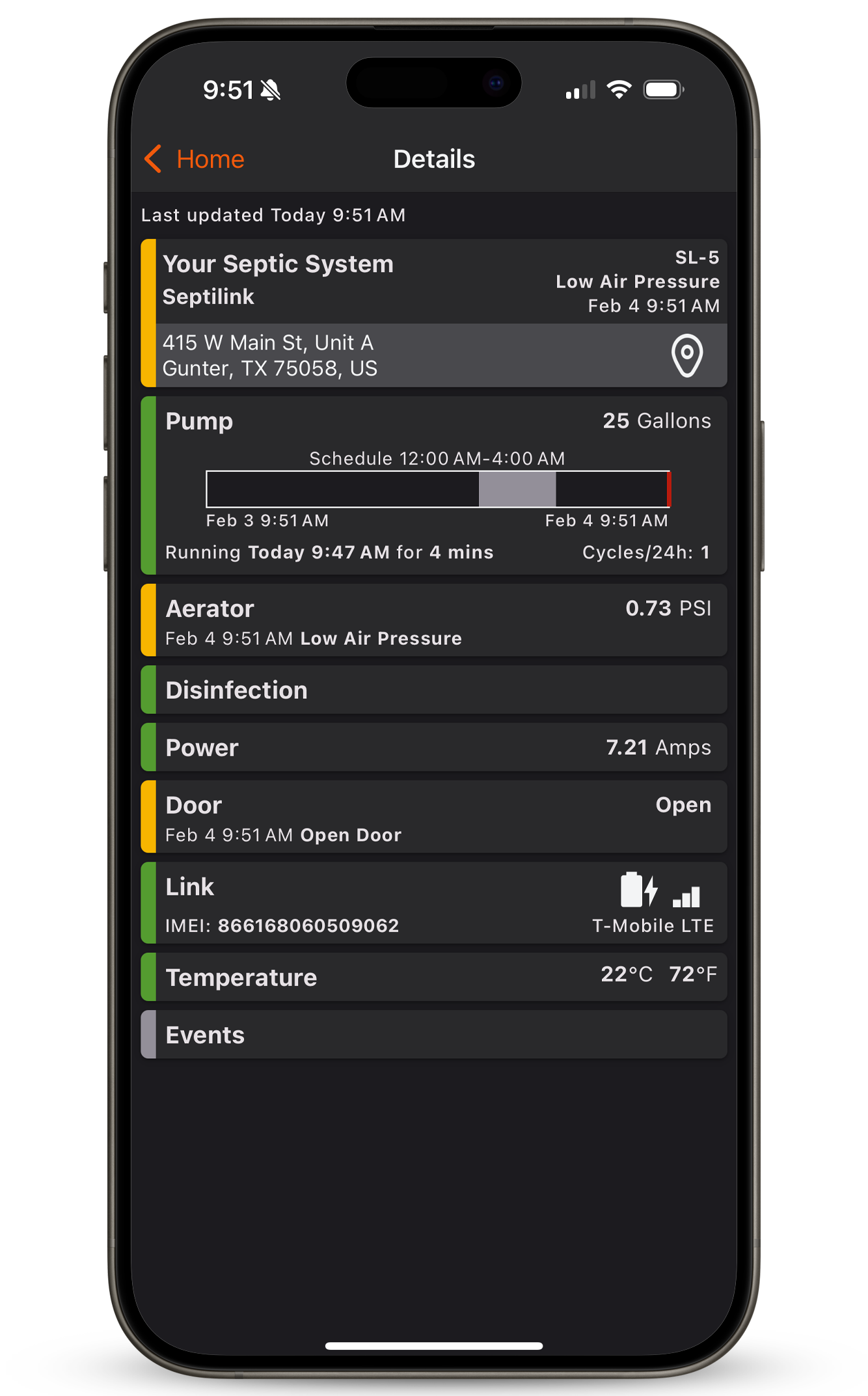 Septilink™, headquartered in North Texas, is an environmental technology company dedicated to providing affordable septic monitoring solutions for homeowners and wastewater industry professionals. Our mission includes preserving Texas' stunning landscapes, which often suffer from problematic wastewater systems. As homeowners ourselves, we experienced firsthand the frustration and concern caused by unreliable septic systems, impacting not only us but also our community. Drawing inspiration from automation advancements in industries like HVAC, irrigation, and security, we recognized the potential for technology to dramatically improve the homeowner experience. In 2022 we assembled a team of top-tier, Internet of Things professionals to develop Septilink™ technology. After nearly two years of intense design and testing, we proudly introduce our inaugural product, the Septilink SL-5, to the wastewater industry.